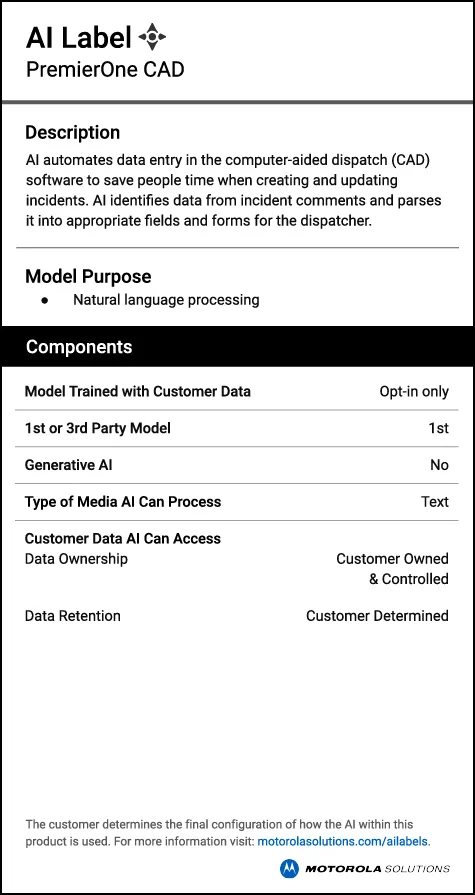 Motorola Solutions AI-enabled technologies help to augment human focus, effort and performance when seconds matter. AI labels provide clear, concise descriptions of how AI is used in their products.